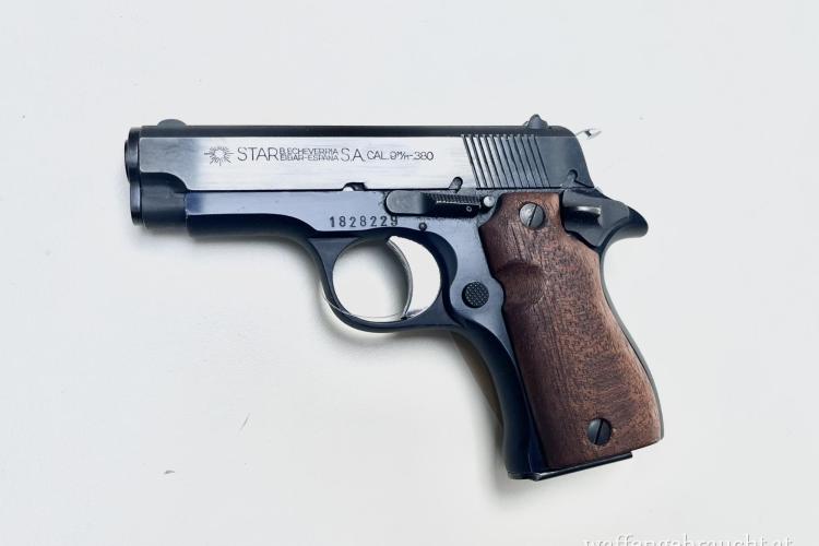 Angeboten wird eine Pistole des Herstellers Star im Kaliber 9x17mm (9mm kurz / .380 ACP). Sowohl das Griffstück und der Schlitten als auch die Holzgriffschalen weisen leichte Gebrauchsspuren auf.