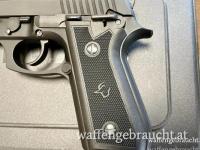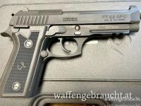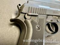 Pistole Taurus PT92AF in matt brünierter Ausführung mit einem 5" / 127 mm langen Lauf. Die Griffschalen sind aus Kunststoff. Die Waffe verfügt über ein 17 Schuss Magazin.