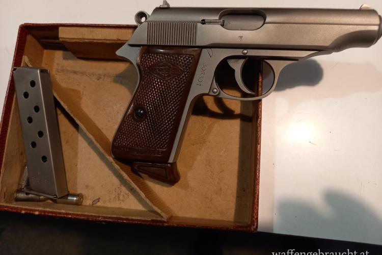 Walther PP Manurhin, sehr guter Zustand, vernickelt, Originalverpackung, zwei Magazine, gleiche Nummern wie Pistole.