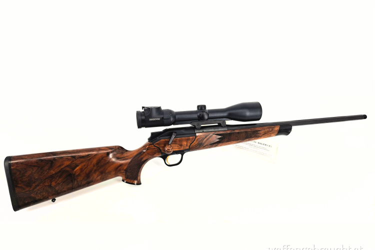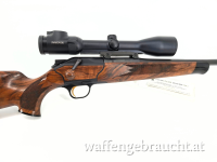 Die Blaser R8 Attaché ist eine luxuriöse Ausführung der Geradezugrepetierbüchse, die sich durch hochwertige Materialien wie einen Holzschaft der Klasse 7 und exklusive Details wie goldfarbene Bedienelemente auszeichnet. Im Kaliber .30-06 Springfield bietet sie eine vielseitige Leistung für verschiedenste Jagdszenarien.