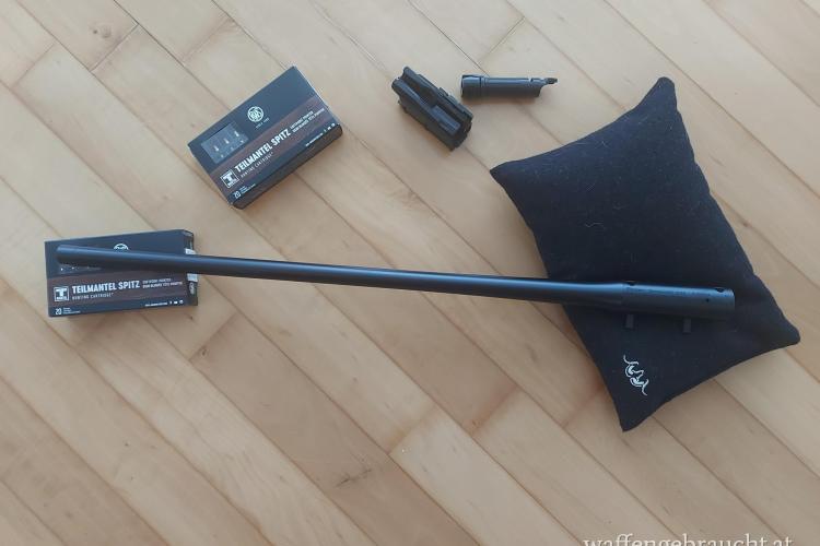 1.) Blaser R8 Austauschlauf, Kaliber .222 Rem., Ausführung Standard (Ø17mm u. 580mm) mit Mündungsgewinde M15x1 inkl. Abdeckkappe, mit Magazineinsatz, Beschuss 2025, ca. 20 Schuss „alt“ (RWS TMS 3,2g/50grain), neuwertiger Zustand sowie