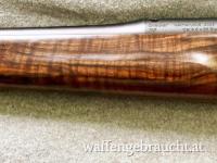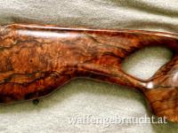 Schaft als Sonderanfertigung in der Ultimate Form in Holzklasse 10, Lauf 17 mm im Kaliber 8,5x55 Blaser mit Lauflänge 58 cm, Gewinde M15x1. Verschluss mit IC Funktion, Abzug in Gold, Kammerkugel Holz.