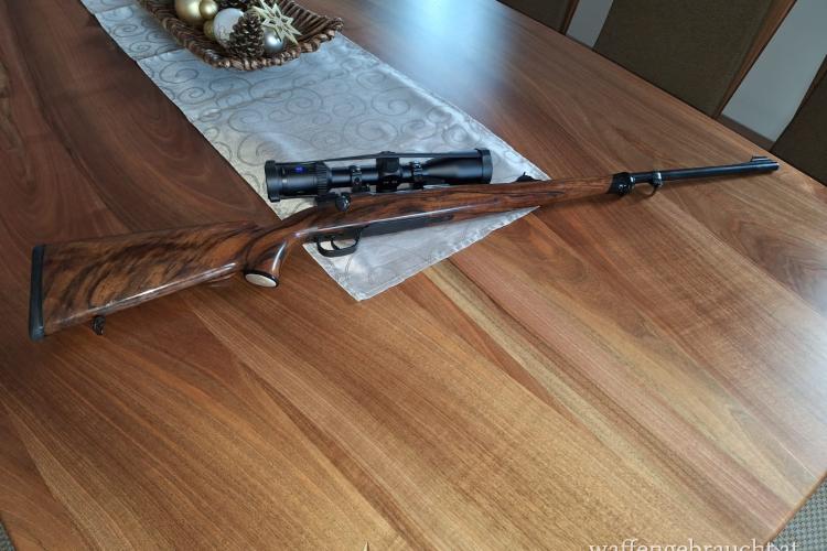 Sehr schöne Voere im Stil der Mauser 98 mit Handschäftung von Phillip Kruschitz. Montiert ist ein Zeiss V6 2-12x50. Gesamtlänge 113cm, Lauflänge 60cm und Gewicht inkl. Optik 4140g.