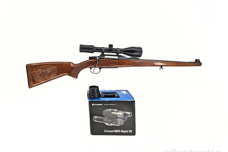 Die Waffe verfügt über ein Meostar 3-12x56 & Pulsar Vorsatzgerät.