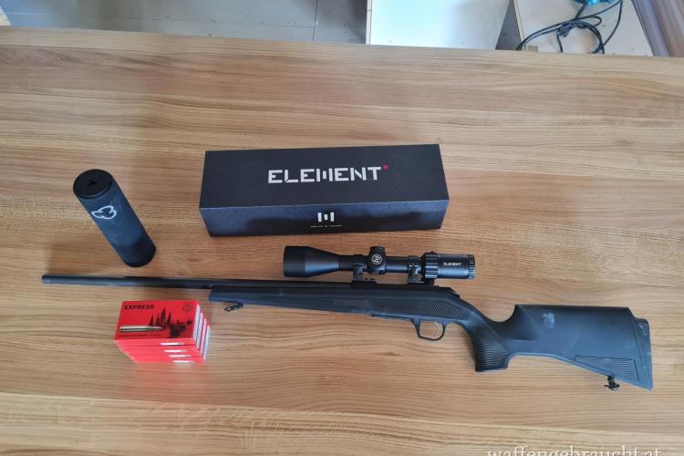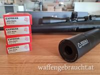 Inkl.Zielfernrohr, Leupold Stahl Montage, Schalldämpfer Roedale Hunter 55+ und Restmunition Geco 76 stk. Abgabe nur an Besitzer mit Gültiger Jagdkarte. 2 Fotos mit Anschusscheibe. 5 Schuss auf einen EURO. Ca 3vm Hochschuss auf 100 Meter.