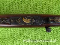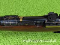Das System, der Magazindeckel, der Abzugsbügel, der Verschluss und die Montagesockel mit Montageringen sind dezent graviert und mit 24 karätigen Goldeinlagen versehen. Ebenso sind der sehr trockene Direktabzug, der Patronenzubringer, der Auszieher und diverse Verschlussteile vergoldet!