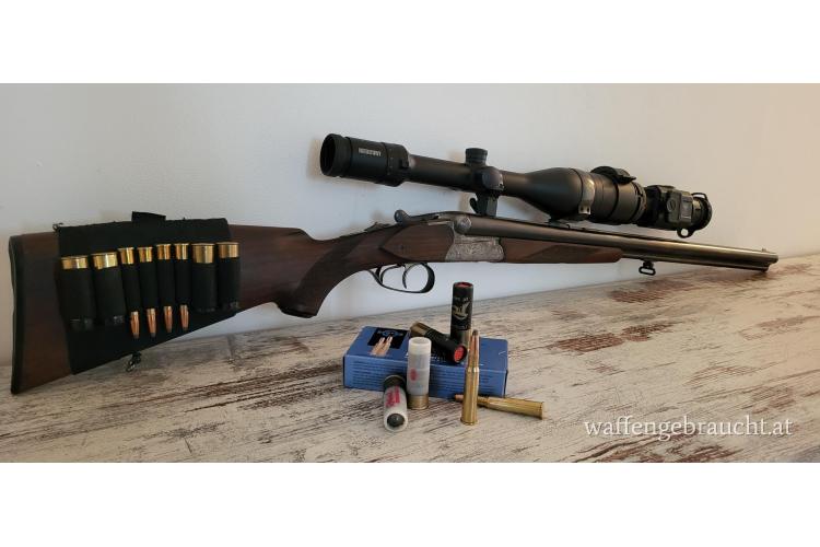 Luxus DRILLING Suhl tiefe Gravuren mit Schwenkmontage und Meopta 3-12x56 LP, Liemke Wärmebild Vorsatz, 7x57R, 16/70, 16/70.