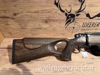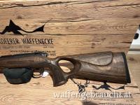 Das Modell besticht durch sein puristisches Design und seine durchdachte Ergonomie. Der stabile Schichtholz-Lochschaft bietet ein großes Daumenloch und eine beidseitige Handballenausformung. Dadurch liegt die Büchse sicher in der Hand. Die Verwendung von Schichtholz sorgt für eine hohe Stabilität und Wetterfestigkeit. Diese Eigenschaft macht das Modell ideal für unterschiedlichste Einsatzbedingungen.