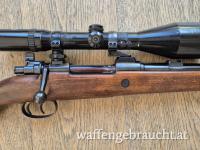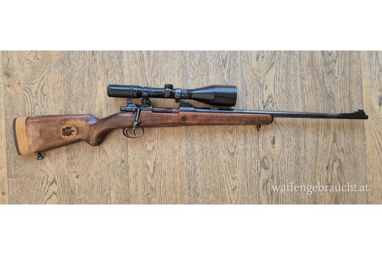 Klassischer Mauser Jagdrepetierer mit deutschem Stecher. Wahrscheinlich handelt es sich um einen Umbau eines K98k. Der Schichtholzschaft müsste eine Militärschaft sein, der umgearbeitet und gekürzt wurde. Ich habe den Schaft etwas verlängert, da dieser extrem kurz war. Die Länge vom Schaftende bis zum vorderen Abzug beträgt 34 cm. Die Kimme fehlt leider, lässt sich aber ersetzen. Die Waffe verfügt über eine Schwenkmontage mit 30 mm Ringen. Das Zielfernrohr S&B 2,5-10x56 ist ausdrücklich nicht Bestandteil des Angebots. Die Funktion der Waffe ist top. Auch die Präzision ist absolut zufrieden stellend. Das Kaliber ist für meine Verhältnisse jedoch etwas zu stark. Eignet sich perfekt zum Umbau als Drückjagdwaffe. Einen Jagdschaft in Holz gebe ich gratis dazu. Bei Fragen einfach melden!