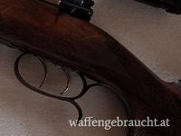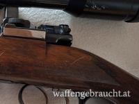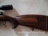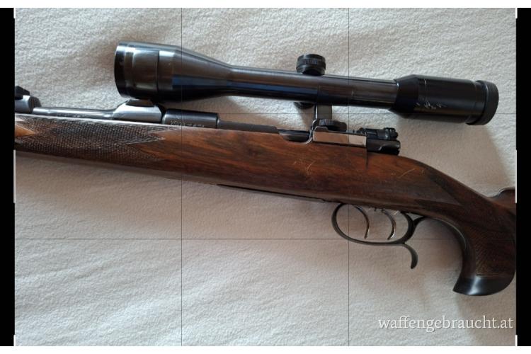 Mauser aus der Waffenschmiede Ferlach, Sehr schöner Schaft mit bayrischer Backe, am Revolvergriff mit Büffelhornabschluss. Teilweise mit Fischhaut verziert. Schaftende im Laufbereich mit Rosenholzabschluss.. Deutscher Stecher mit zusätzlichem Fingerhacken Zielfernrohr Habicht 6x42 Im Bereich des Abzuges leichte Gebrauchsspuren am Holz. Wurde bis vor kurzem noch jagdlich geführt. Verkauf nur an Berechtigte laut neuem Waffengesetz. Da Privatverkauf keine Garantie, sowie Gewährleistung oder Rücknahme.