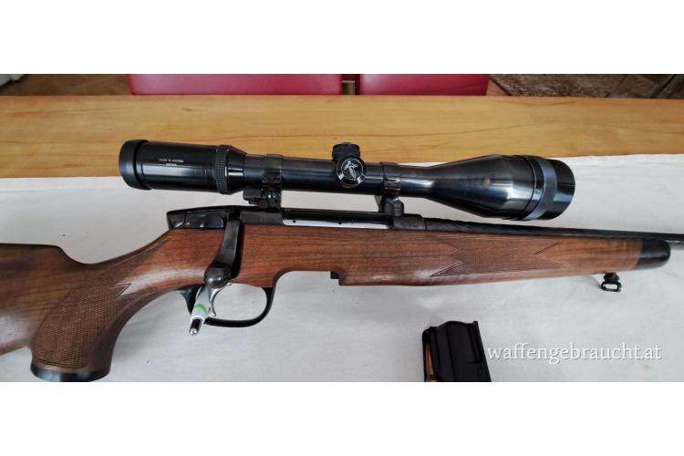 Ich trenne mich wegen Überbestandes von meiner Steyrer 7 mm RemMag. Ich habe sie vor allem zur Rotwildbejagung eingesetzt — eine Jagdart, die ich wegen eines Revierwechsels kaum mehr ausübe. Ich habe bei Beauftragung des Gewindeschneidens bei Büma Enengl auch die Kürzung des Laufes von 65 auf 60 cm durchführen lassen, was die Waffe deutlich führiger gemacht hat — ohne jeden Präzisionsverlust.