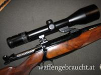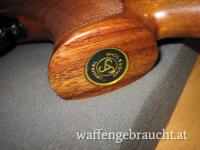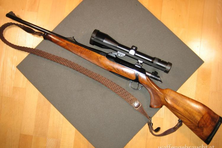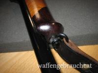 Beschreibung: Hochwertige Repetierbüchse eines Markenherstellers in sehr guter Ausführung und solider Ausführung. Gutes Schaftholz mit Hartholzabschluss, geschnittene Fischhaut am Vorderschaft und Pistolengriff Gummischaftkappe.Magazun aus brüniertem Stahl, französicher Stecherabzug, Zylinderverschluss mit Sonnenschliff und 6 Verschlusswarzen.