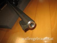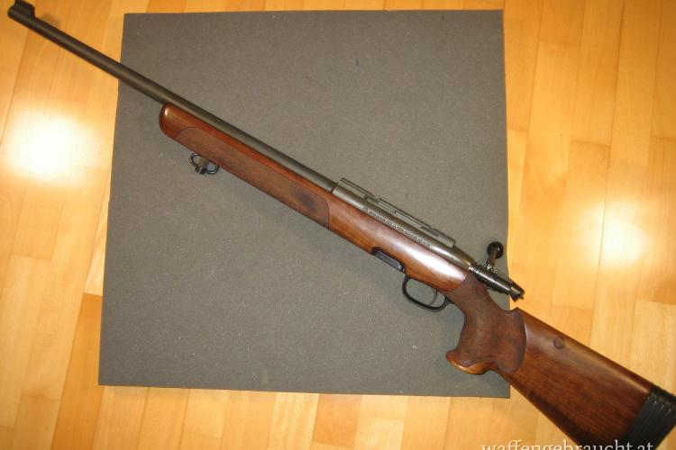 Beschreibung: Matchbüchse mit kalt gehämmertem 650mm Lauf, 22mm Außendurchmesser an der Mündung ( angesenkt), System und Lauf haben eine parkerisierte Oberfläche. Holzschäftung mit punziertem Pistolengriff und Vorderschaft. Originale Gummischaftkappe, UIT Schiene, Druckpunktabzug, großer Kunststoffkugel am Kammerstängel, seitliche Schiebesicherung, originales SSG .308 Kunststoffmagazin. 11mm Montageschiene.