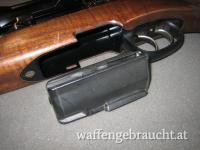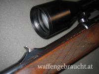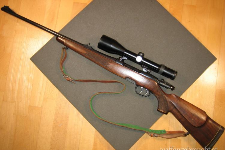 Kalt gehämmerter Lauf mit klassischer Außenstruktur glänzend brüniert. Nußholzschaft mit Hartholzabschlüssen und originaler ventilierter Schaftkappe. Trommelmagazin aus Kunststoff, deutscher Stecherabzug. Zeiss Zielfernrohr mit variabler Vergrößerung und Plex Absehen mit Leuchtpunkt in sehr gutem Zustand.
