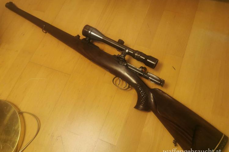 Mannlicher Schönauer Stutzen der Österreichischen Waffenfabriksgesellschaft Steyr (ÖWG), Kaliber 8x57 IS, schöner dunkler Schaft mit ZF Kahles 39S2 mit Fadenkreuz, Neubeschuss Wien, Neubrünierung durch Fa. Kruschitz Wien, Direktabzug Fa. Kepplinger Kufstein (in den Bildern noch Deutscher Stecherabzug), elegantes und führiges Gewehr mit Monogramm mit sehr gutem Schussbild