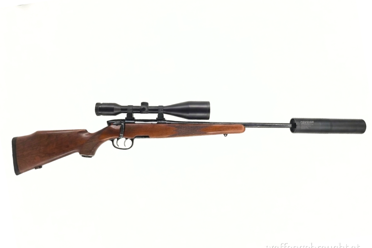 Das Gewehr verfügt über ein Hahles Helia 7x56 Zielfernrohr und einen SD Hausken JD 224XTRM Schalldämpfer.