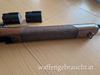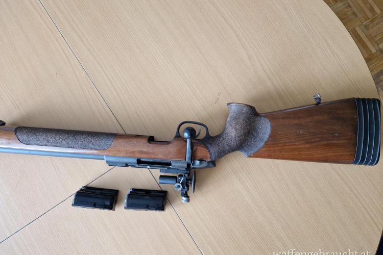 Steyr SSG69 mit schönem Holzschaft, mit Riemenösen ohne UIT Schiene, und neuem Abzugsbügel, mit Diopter , Korntunnel, 5 Schuss Magazin neu, Magazin zum Einzelladen, verstellbare Schaftkappe, und 1 Originale Steyr Schaftkappenverlängerung.