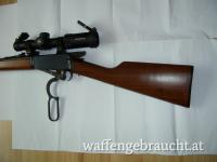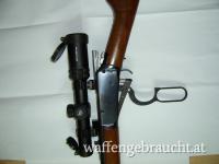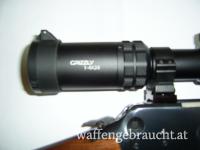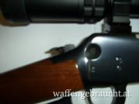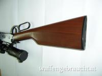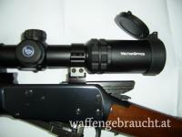 Winchester Carbine 1894 AE (seitlicher Patronenauswurf), Kaliber 30-30 Winchester, Lauflänge ist 20 Zoll, Zielfernrohr Vector Grizzly 1-4x24 mit Absehen 4 und zuschaltbaren roten Leuchtpunkt, Weaver Montagebasen und Leupold PRW Montageringen, also eine ordentliche Montage des Zielfernrohrs, Hahnsporn seitlich rechts wegen besserer Bedienbarkeit des Abzughammers. Die Brünierung ist ohne ersichtliche Gebrauchsspuren, nur minimale Kratzer im Schaftholz. Laufzustand ist Spiegelblank. Originale USA-Winchester.