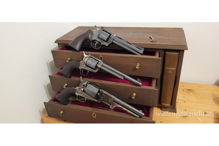 Dieses Set stammt aus meiner Sammlung. Die Revolver wurden nicht gebraucht und nicht geschossen. Die Holzkassette hat geringste Lagerspuren.
