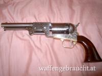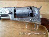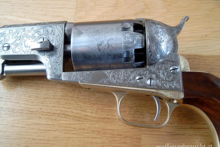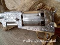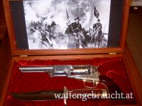 Colt Dragoon CIVILIAN 1848 im cal.44. Sehr guter bis neuwertiger Erhaltungszustand, polierte makelose Griffschalen aus Edelholz. Besonders reiche und tiefgestochene Arabesken in handgravur. Die Waffe ist unbenützt und befindet sich in einer extra dafür hergestellten Kasette aus feinem Holz mit roter Samteinlage. Dabei ist noch ein wunderschönes Bowie Messer. In der Innenseite der Kasette befindet sich noch ein Foto ( hinter Glas ) einer Kavallerieeinheit. Es müsste John Wayne sein. Die ist genau die selbe Waffe die im Internet unter www.ubertireplicas.com beschrieben ist. Eine wunderschöne, gewichtige und einzigartige Waffe, die so nur noch sehr schwer bis gar nicht mehr so zu bekommen ist. Bei Interesse kann ich noch mehr Fotos übersenden.