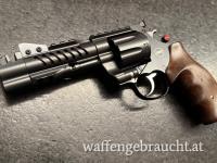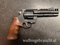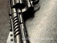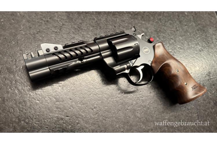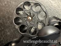 Die Trommel dreht sich butterweich und rastet komplett starr ein und ist per Knopfdruck zu entnehmen. Der Revolver ist komplett DLC beschichtet und hat einen Wallnussholzgriff. Ein Gummi Griff ist auch dabei.