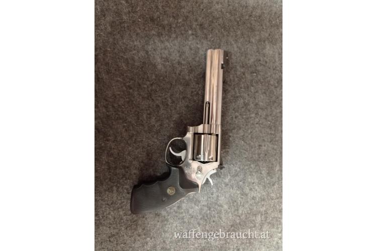 Der S&W 686-6 in 6" in Stainless Steel hat eine 6-Schuss Trommel. Er weißt auch die üblichen Gebrauchsspuren auf, die bei Gebrauch unvermeidlich sind.