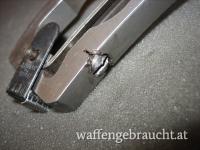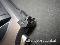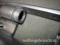 Zustand: Die Waffe ist funktionsfähig, hat aber starke Gebrauchsspuren. Das Korn hat etwas Spiel, das Kimmenblatt ist etwas verbogen ( Foto 8) und die Ausstoßerstande wurde am Ende mit einer Zange verschrammt( Foto 9). im Bereich der Spannschraube für die Hammerfeder ( unter dem Griffstück) wurde der Rahmen offensichtlich mit einer Eisensäge mit einem Schlitz versehen ( Foto 10). Lauf und Patronenlager sind in Ordnung, eine Magnumrille ist nicht vorhanden. Das Timing ist noch akzeptabel.