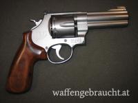 Beschreibung: SA/DA, Sainless Steel, Revolver aus der Sonderserie Jerry Miculek. Trommelkapazität 6 Patronen. Holzgriff mit den Initialen "JM" auf beiden Seiten.
