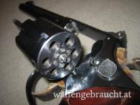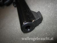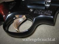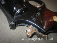 Beschreibung: Brünierter Revolver in sehr hochwertiger Ausführung. Hammer mit breitem Sporn und breites Abzugszüngel beide mit Bunthärtung. Verstellbare Kimme und Targetkorn, S&W Holzgriffschalen mit Enblem.