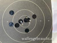 Auf der schwarzen Schnellfeuerscheibe Distanz 15m hält er die Mouche mit normalen MagTech Patronen.