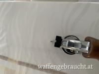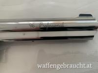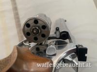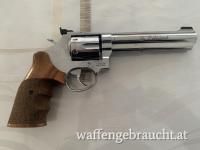 Lauflänge: 6", vernickelte Ganzstahlwaffe, sechsschüssig, höhen- und seitenverstellbares Visier, Abzug und Hahn blank, Sportgriff.