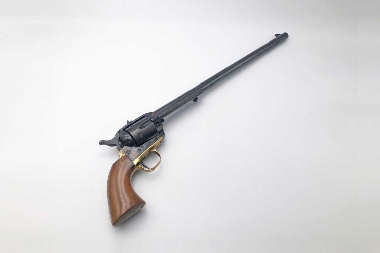 Achtung Westernsammler! Schöner und beeindruckender Revolver Armi Jäger Frontier Buntline, im Kaliber .357 Magnum, 42 cm Lauflänge, 16 1/2 Zoll, SA-Revolver, fixes Visier, brünierter Lauf, Trommel, Abzugsbügel und Griffstück, Rahmen buntgehärtet, glatte Holzgriffschalen, gebraucht, sehr guter Erhaltungszustand, die Stahlteile stellenweise leicht fleckig, der Lauf innen spiegelblank, technisch in Ordnung