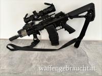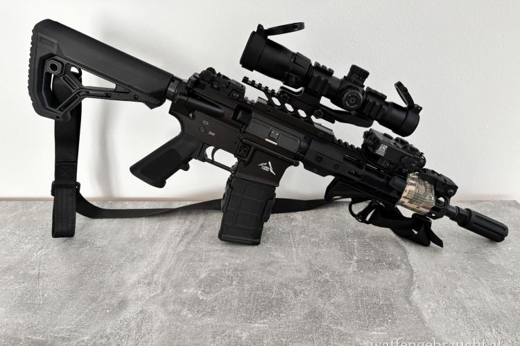 Schiesst sich wunderbar und sehr präzise auf 25-100m (darüber hinaus hatte ich keine Möglichkeit). Verbaut wurde ein Blast Can Kompensator, der sich perfekt für kurze Läufe eignet. Ebenfalls wurde eine erhöhte Montage, ein ZF und ein Lasermodul verbaut. Alle Magazine die dabei sind, sind 10Schuss Magazine (2 davon in 30Schuss Optik).
