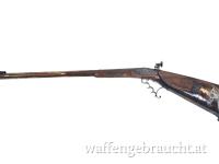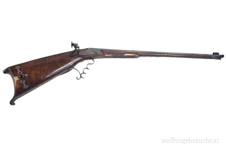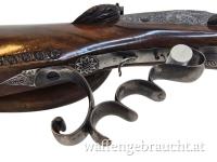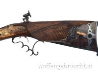 Diese Windbüchse aus der Wiener Werkstatt von Karl Pirko ist ein eindrucksvolles Beispiel traditioneller Büchsenmacherkunst. Die Waffe besticht durch ihren kunstvoll gestalteten Schaft mit reich ausgeführten Schnitzereien sowie durch fein gravierte Metallbeschläge und Systemteile. Besonders auffällig sind die dekorativen Applikationen am Schaft sowie die detailreiche Gravur der Schlossplatten. Die charakteristische Abzugsanlage mit mehrfingrigem Abzugsbügel unterstreicht den historischen Charakter dieser besonderen Waffe. Ergänzt wird die Ausstattung durch eine klassische Visierung mit Diopter, die präzises Zielen ermöglicht. Der Zustand der Windbüchse ist gut und macht dieses Stück zu einer außergewöhnlichen Rarität für Sammler historischer Luftdruckwaffen und Liebhaber traditioneller Wiener Büchsenmacherkunst.