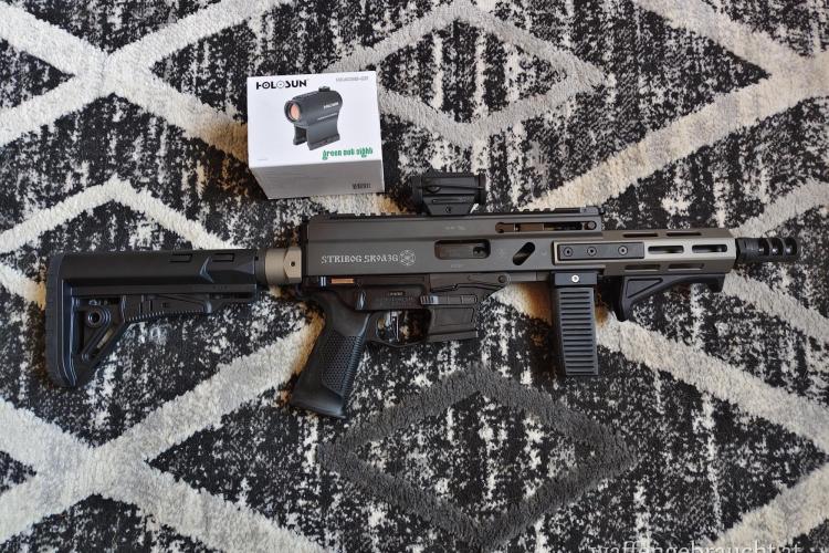 Verbaut ist ein holosun green dot und 2 verschiedene griffe.