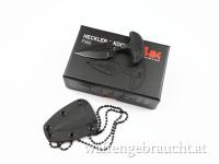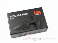 "Der kompakte klassische Push-Dagger Heckler & Koch FX02 ist das ultimative Last-Ditch-Tool zum intuitiven Gebrauch in Extremsituationen, die von maximalem Stress gekennzeichnet sind. Die zweiseitig geschliffene Klinge aus schnitthaltigem D2-Stahl ist gegen Reflexion mit eine schwarzen Titan-Beschichtung versehen. Der symmetrische Griff aus unverwüstlichem FRN bietet zuverlässige Kontrolle bei allen Gegebenheiten. Für optimale Griffigkeit ist die Oberfläche mit der aktuellen HK-Textur strukturiert. Sicher geführt wird der Dagger in einer symmetrischen Kydex-Scheide im Stil der OSS-Lapel-Dagger, der beispielsweise mit der im Lieferumfang enthaltenen Kugelkette um den Hals getragen werden kann."