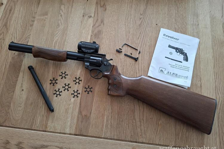 Alfa proj Revolver Carbine im Kaliber 9x19 mit 7 Moonclips und Ladehilfe, Original-Visierung und Red dot von Primary Arms, im Original-Koffer mit Anleitung und Einschussbild, eingeschossen auf 25 Meter, ca. 500 Schuss.