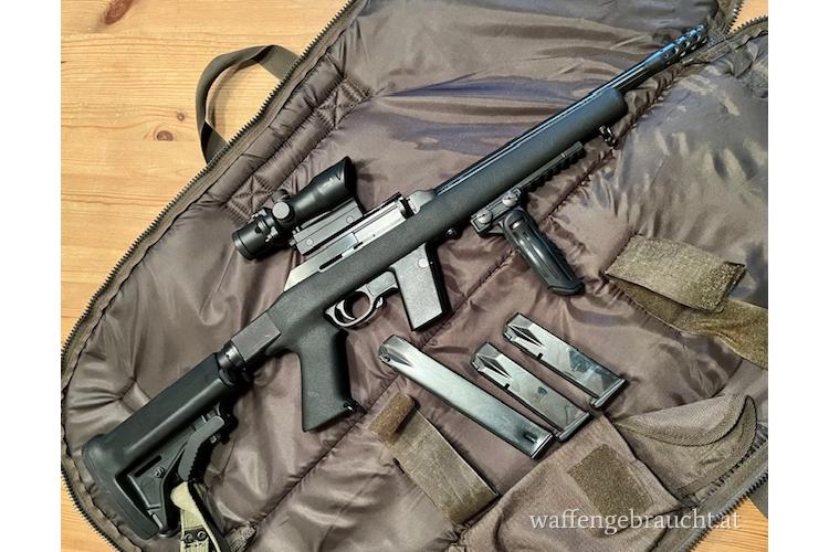 Gut erhaltener CAMP CARBINE im cal. 9mmP mit Mündungsdämpfer, Tragegurt und Tasche sind im Preis Inklusive. Zielfernrohr WALTHER PS44 mit 5 Stufen Leuchtpunkt Optik. Siehe Fotos!!