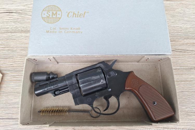 Zum Verkauf steht ein seltener, voll funktionsfähiger Revolver, Mod. SM Chief, in Kaliber 9mm R.K. Der Revolver befindet sich in einem guten, gebrauchten Zustand und verfügt über eine weiter hinten angebrachte Laufsperre, weshalb der Eindruck einer "scharfen Mündung" entsteht.