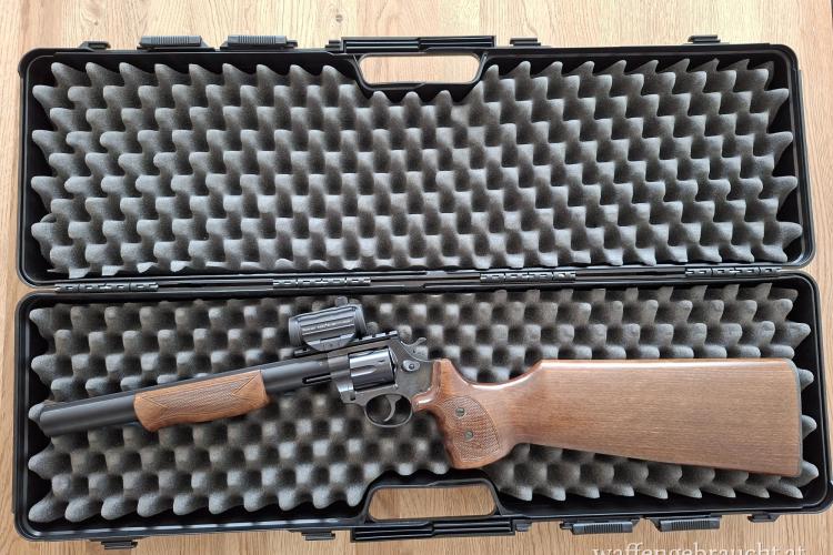 Alfa proj Revolver Carbine im Kaliber 9x19 mit 7 Moonclips und Ladehilfe, Original-Visierung und Red dot von Primary Arms, im Original-Koffer mit Anleitung und Einschussbild, eingeschossen auf 25 Meter, ca. 500 Schuss.