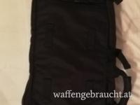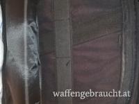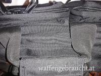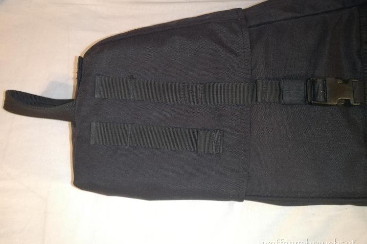 High End tactical drag bag (Sturmgewehrtasche) aus schwarzem, extrem widerstandsfähigem Cordura. Mit Wabenschaumstoff gepolstert. Griffe gesteppt vernäht. Heavy duty Reißverschluss, durch Lasche geschützt, zusätzlich gesichert durch 5 verstellbare Gurtbänder mit Schnappverschluss. 2 geräumige Außentaschen mit Reißverschluss, 3-seitig zum Öffnen (eine mit. elastischen Bändern, z. B. zur Aufbewahrung von 4 Großraummagazinen). Innen extra eingearbeitete stoßgeschützte Hinterschaftsicherung. Gurtsicherung über die gesamte Waffenlänge. Extra aufgesetzte wasserdichte Schutzkappe müdungsseitig. Tasche rückseitig mit eingearbeiteten Tragegurten, zur Trageweise als Rucksack. Max nutzbare Innenlänge 105cm.