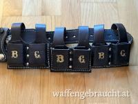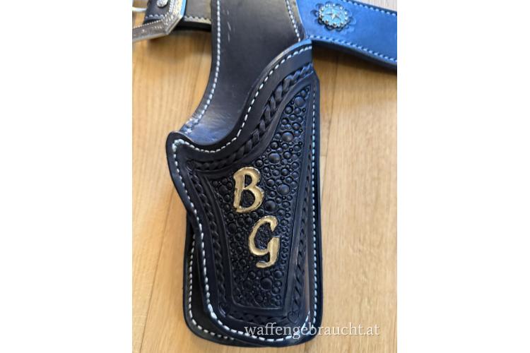 Wild Bunch Rig mit Magazinhaltern, schwarzes Leder, vielfach verziert, Holster mit eingearbeiteten Stahlblech zur Formbeständigkeit. 5 ½ Zoll Holster