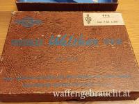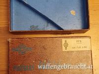 Typische Walther-Papschachtel der Firma Manurhin in brauner Lederoptik mit blauer Schrift, bezeichnet „Pistolet Walther PPK“, auf einer aufgeklebten Banderole das Firmenlogo von Maurhin und „PPK Cal. 7,65 (.32)“ sowie zwei Nummern (247 und 100576). Leicht bestoßen, kleine altersbedingte Schäden, aber in gutem Gesamtzustand, stabil und funktionsfähig. Innen blau, die meist fehlende eingeklebte Unterteilung vorhanden. Maße 17 x 13 x 3 cm, meine PPK passt wunderbar hinein. Versandkosten: Österreich € 15,-, Deutschland € 20,-, restliche EU € 25,- Versand nur innerhalb der EU, Bieter von außerhalb der EU mögen sich bitte vor dem Bieten mit mir in Verbindung setzen. Da ich privater Sammler bin und keine Firma darf ich darauf hinweisen, dass bitte kein Rücktritt oder Umtausch möglich ist. Der Auktionsgegenstand wurde nach bestem Wissen und Gewissen beschrieben, aber da ich kein Fachmann bin, kann ich leider auch keine Garantie auf Originalität oder sonstige eventuell wichtigen Umstände geben. Der Verkauf erfolgt unter Ausschluss jeglicher Gewährleistung.
