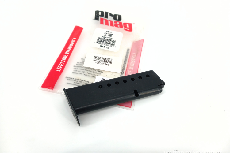Das ProMag Magazin für die Star BM 9mm (Modell-Nr. STA 30) ist ein gängiges Ersatzmagazin aus brüniertem Stahl (Blue Steel) mit einer Kapazität von 8 Schuss