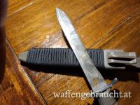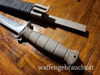 Die Messer wurden entrostet, poliert, geschliffen. Einer Klinge wurde mit Säure ein Camouflage Muster verpasst, die Scheide wurde mit 4m Paracord gewickelt. Klinge rasiermesserscharf geschliffen.