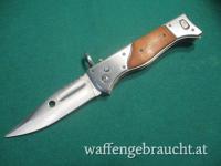 AK-47 Fallschirmspringer-Bajonett mit Springerfunktion mit Gürtelclip und Tasche. Klingenlänge ca. 12 cm, Gesamtlänge ca. 27.-- cm. Versand gegen Vorauszahlung und Übernahme der Versandkosten (€ 6.00) ist möglich. Kein Auslandsversand. Laut EU-Recht kein Umtausch bzw. Rücknahme und keine Garantie bzw. Gewährleistung, da Privatverkauf. Verkauf nur an Personen über 18 Jahre.
