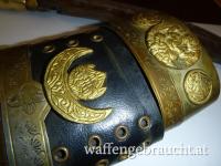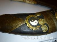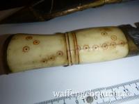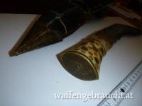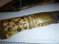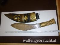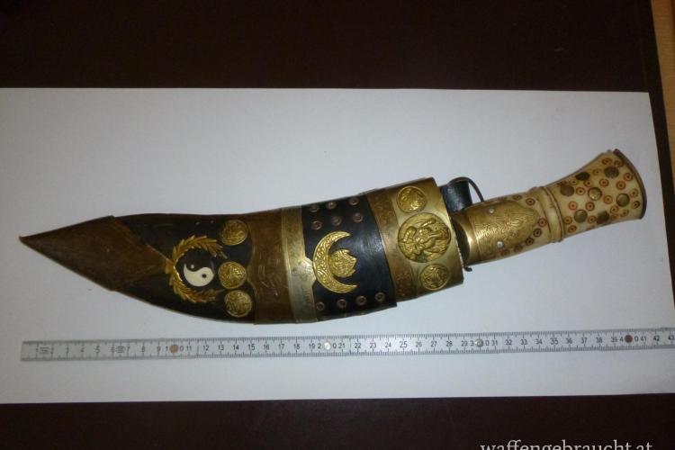 Habe im Internet fast identische Messer mit etwas weniger Verzierung um 2250 und um 2650 Euro gefunden. Das finde ich aber etwas übertrieben. Dieses besitzt einen Griff aus Yak-Knochen welcher leider einen feinen nicht durchgehenden Sprung hat. Weiter fehlen die beiden üblichen Beimesser. Das Alter dürfte so 150 bis 200 Jahre betragen?