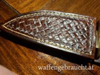 2 Stk. perfekt handgearbeitete Messerscheiden. Gefertigt aus 3mm bayerischem Rindsleder, mit Sattlernaht vernäht, Muster gestanzt, gefärbt.