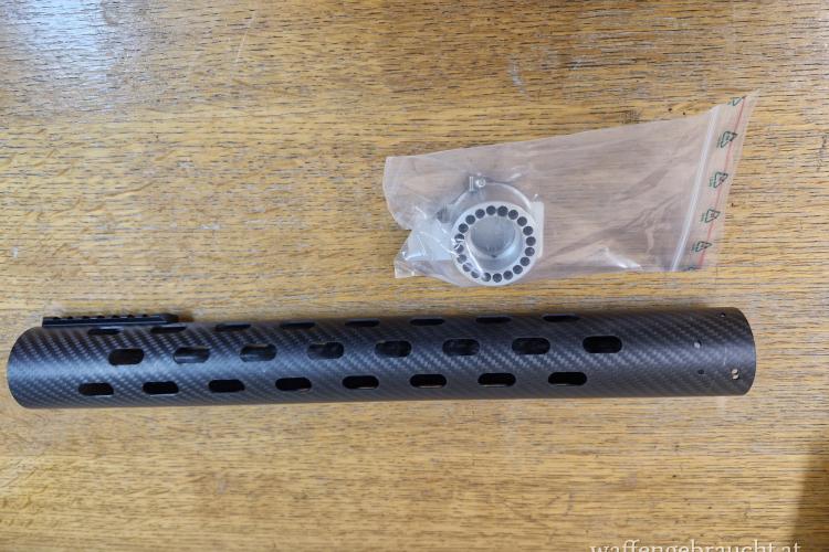 Verkauft wird hier ein Carbonvorderschaft mit integrierter Picatinny Rail am vorderen Ende des Schaftes zur Aufnahme von Zweibein oder dergleichen.