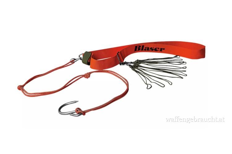 Die Blaser Wildbergehilfe ist ideal geeignet zum Bergen von schwerem Wild. Mit dem integrierten Edelstahl-Wildhaken wird das erlegte Wild einfach am Unterkiefer eingehängt und kann anschließend geborgen werden. Durch das Varioseil in Verbindung mit dem Stahlhaken kann die Wildbergehilfe auch zum Ausschweißen verwendet werden.